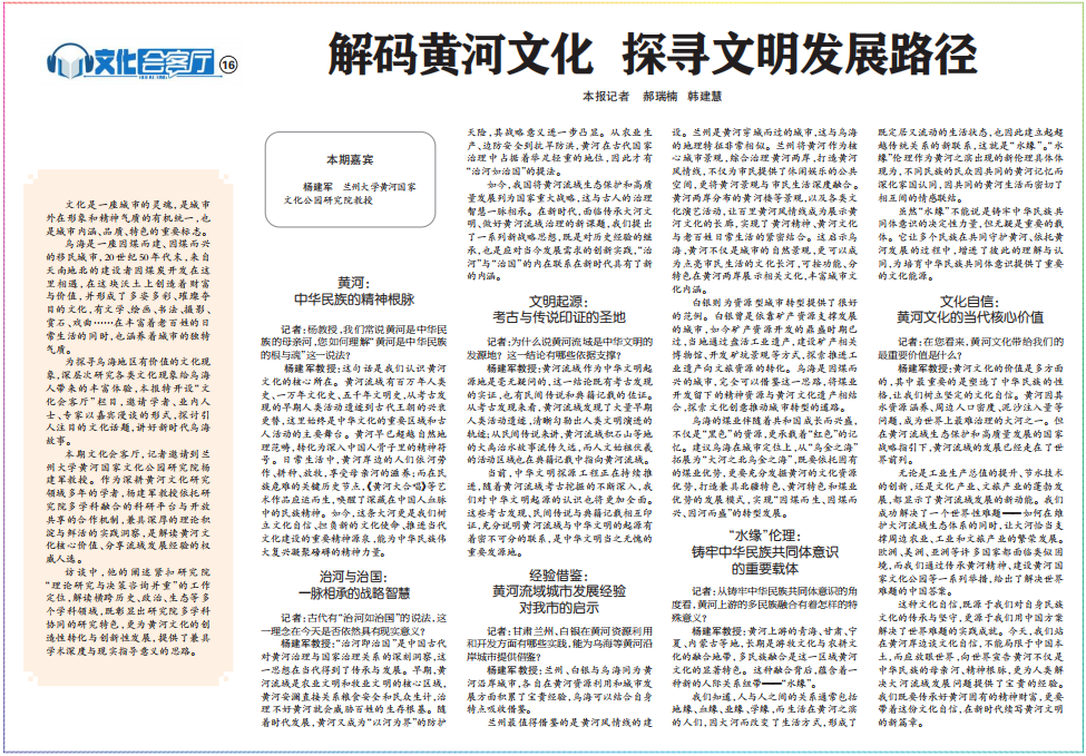 本期文化会客厅,记者邀请到兰州大学黄河国家文化公园研究院杨建军教授。作为深耕黄河文化研究领域多年的学者,杨建军教授依托研究院多学科融合的科研平台与开放共享的合作机制,兼具深厚的理论积淀与鲜活的实践洞察,是解读黄河文化核心价值、分享流域发展经验的权威人选。访谈中,他的阐述紧扣研究院“理论研究与决策咨询并重”的工作定位,解读横跨历史、政治、生态等多个学科领域,既彰显出研究院多学科协同的研究特色,更为黄河文化的创造性转化与创新性发展,提供了兼具学术深度与现实指导意义的思路。